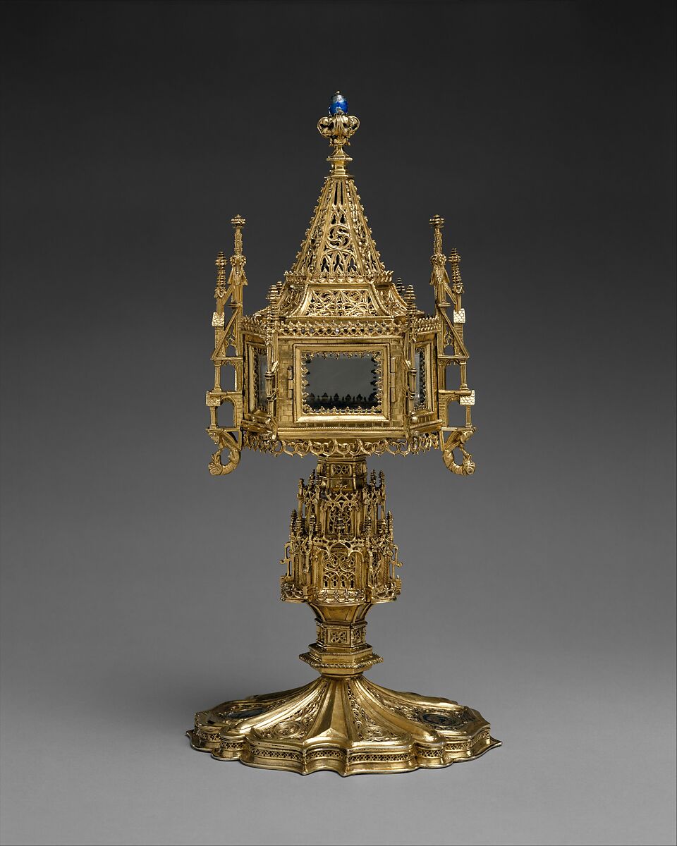 This monstrance is constructed largely of silver sheets that have been decorated with elaborate pierced work, a technique favored by Spanish goldsmiths in the early sixteenth century. The enamel and niello medallions represent a lioness breathing life into its cubs and a pelican feeding its fledglings with the blood of its breast. Both subjects allude to the redemption of humankind through Christ's sacrifice, suggesting that the vessel originally displayed a Eucharistic wafer.