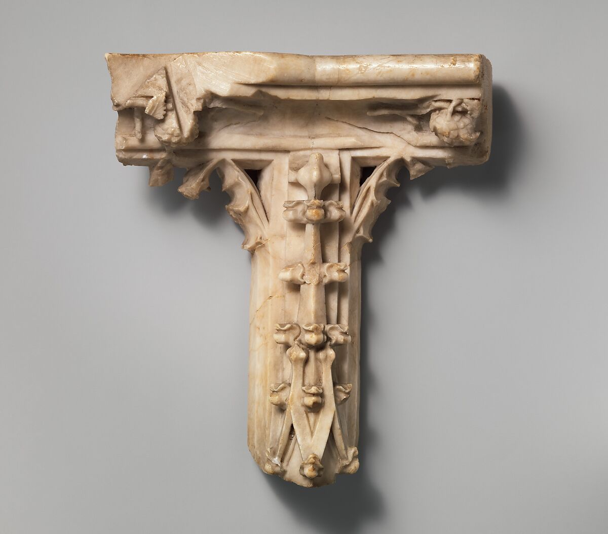 This delicately carved fragment comes from the tomb of John the Fearless and Margaret of Bavaria, Duke and Duchess of Burgundy, Dijon, one of the most important sculptural monuments of the middle ages. It belongs to the architectural decoration that surmounts the mourner figures which form the principle decoration of the sides of the tomb. Made originally for the Chartreuse de la Sainte-Trinité de Champmol, the Carthusian monastery on the outskirts of Dijon, the tomb has been reconstructed in the Musée des Beaux-Arts in Dijon where it is exhibited today.