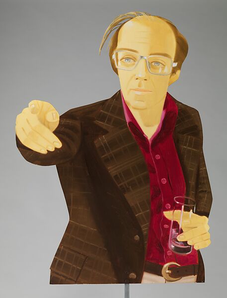 A year after Alex Katz donated Philip Pearlstein's portrait of Katz (1978.282) to The Met, the museum purchased Katz's portrait of Pearlstein. The two make a dramatic contrast. Besides a greater degree of abstraction, Katz’s portrait is rendered on a shaped piece of aluminum that the artist cut from a larger sheet. In 1959, Katz pioneered a new genre of painting called the cutout. For centuries, paintings were primarily made on square or rectangular supports that mimicked the effect of a window. Cutouts, on the other hand, are cropped so that their edges conform to the contours of the subject. Counterintuitively, Katz depicts the front of Pearlstein on both sides of the aluminum. All face and no back, his portrait is flat like a painting but occupies space like a sculpture. Its composition encourages us to not only walk around it, but also to interact with it as if it were an actual human figure.