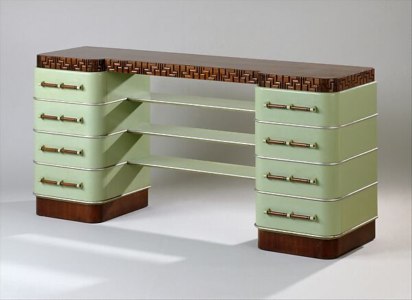 This double pedestal sideboard is part of a suite designed by Weber for the Grand Rapids Chair Company. (See MMA 1985.86.2 for an example of an armchair that was part of the suite.) In each chartreuse lacquered pedestal of the sideboard, four vertically stacked drawers with rounded front edges are separated by horizontal silvered banding. Each pedestal is raised on a recessed dark wood foot, and the two pedestals are joined with a recessed dark wood top, carved with an abstract frieze, and three recessed horizontal stretcher-like shelves. The suite was shown at the Rike-Kumler department store in Dayton, Ohio in 1928.