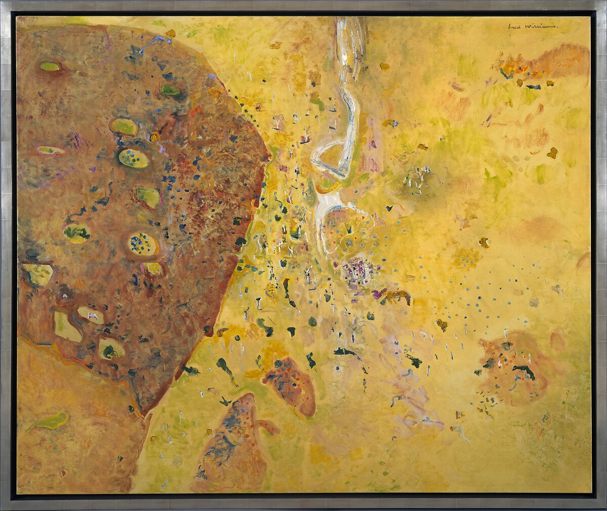 This landscape, Winjana Gorge, Kimberleys, I is Williams' depiction of a uniquely Australian natural motif. The Kimberley is the most northwestern region of Australia, a rugged and sparsely wooded plateau, and Winjana Gorge, a dramatic rise of limestone cliffs, was carved out over prehistoric time by the passage of the Lennard River. As he did for other depictions of the Australian landscape, Williams traveled to the Kimberley and surveyed the land from an airplane, making sketches and taking photographs. Returning to the studio, he developed his aerial observations of the Winjana Gorge into this finished painting. The arid surfaces of the cliffs, spotted with clusters of vegetation, the whitish streak of the riverbed, and the yellowish earth surrounding the gorge are presented to us in a bird's-eye view, like a vibrant and painterly map.
