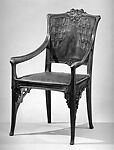 This arm chair comes from the dining room designed for the Paris apartment of the engineer Auguste Rateau. The project was overseen by Lévy-Dhurmer, a ceramist who turned to painting and decorating. Each room was conceived according to a unified theme, in this case wisteria, a symbol of welcome. Lévy-Dhurmer entrusted the execution of his designs to a number of highly skilled makers. The woodwork and furniture were made by Édouard-Louis Collet, who covered the door and wall panels with perfectly book-matched quartered walnut veneer inlaid with purplish amaranth wood representing clusters of wisteria blossoms. The embossed leather chair upholstery was supplied by M. Leroy-Desrivières. For more information on the full room, refer to MMA 66.244.1-.25.