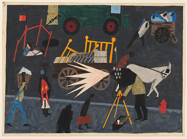 In this work, the artist positions the viewer along a busy street in Harlem, which is bustling with activity. A construction worker descends into a manhole. A finely dressed businessman with a briefcase hurries to work, while a horse-drawn cart carries a brass bed frame—perhaps a sign of new arrivals to the neighborhood. The movement in the scene is accentuated by Lawrence’s frequent use of diagonal lines and angular shapes. In the midst of this colorful urban maelstrom, a photographer snaps a group portrait of a well-dressed family, the bright flash of his camera forming a dynamic barbed abstract form. Itinerant portrait photographers practiced their vocation on the streets of Harlem in the 1930s and ‘40s, capturing on-the-spot likenesses in tintypes (direct positive impressions on thin iron sheets) with box cameras.