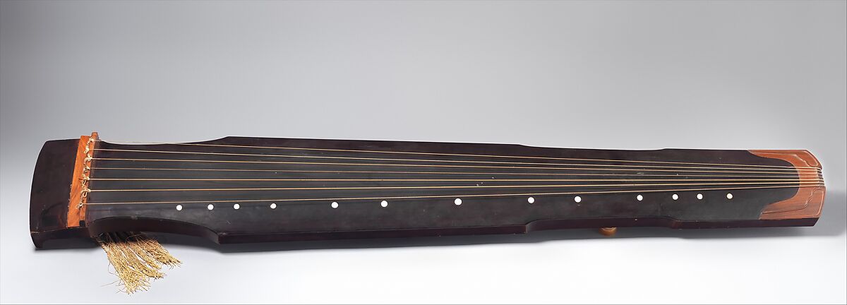 Endowed with cosmological and metaphysical significance and empowered to communicate the deepest feelings, this zither, beloved of sages and of Confucius, is the most prestigious instrument in China. Han Dynasty (206 B.C.-220 A.D.) writers state that the qin helped to cultivate character, understand morality, supplicate gods and demons, enhance life, and enrich learning. Ming Dynasty (1368-1644) literati who claimed the right to play the qin suggested that it be played outdoors in a mountain setting, a garden or a small pavilion or near an old pine tree (symbol of longevity) while burning incense perfumed the air. A serene moonlit night was considered an appropriate time for performance. Each part of the instrument is identified by an anthropomorphic or zoomorphic name and cosmology is ever present: for example, the upper board of wutong wood symbolizes heaven, the bottom board of zi wood symbolizes earth. Qins over a hundred years old are considered best, the age determined by the pattern of cracks (duanwen) in the lacquer. The 13 studs (hui) indicate finger positions. Strings of varying thicknesses are made of twisted silk.
