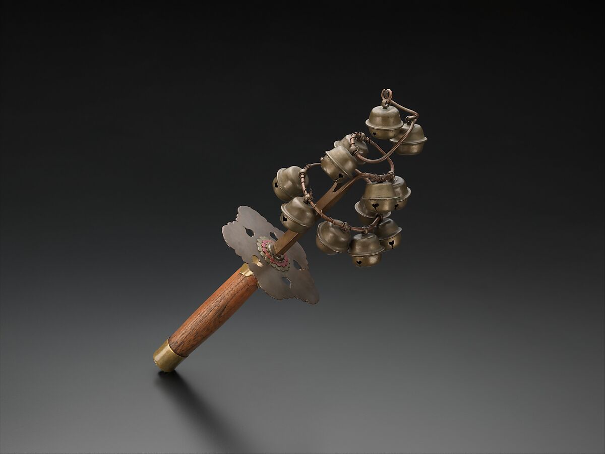 The term suzu refers to two Japanese instruments associated with Shinto ritual: (1) a single large crotal bell similar in shape to a sleigh bell and having a slit on one side; and (2) a handheld bell-tree with small crotal bells strung in three levels on a spiraling wire. The larger form may be hung from a rafter in front of a Shinto shrine and sounded by a robe or ribbons that hang within reach of the worshipper. The smaller suzu seen here is supported atop a handle and is held by female shrine attendants (miko) costumed in traditional robes, white-powdered faces, and wearing Heian-period coiffure during performances of kagura dance. Kagura (music for the gods) is a term encompassing Shinto instrumental music, songs, and dances performed at shrines and at court. It was formalized as early as 773, when it appeared in the palace repertoire. These small bells, ritual implements of great antiquity, may also be grouped together in bundles for folk and ceremonial performances.