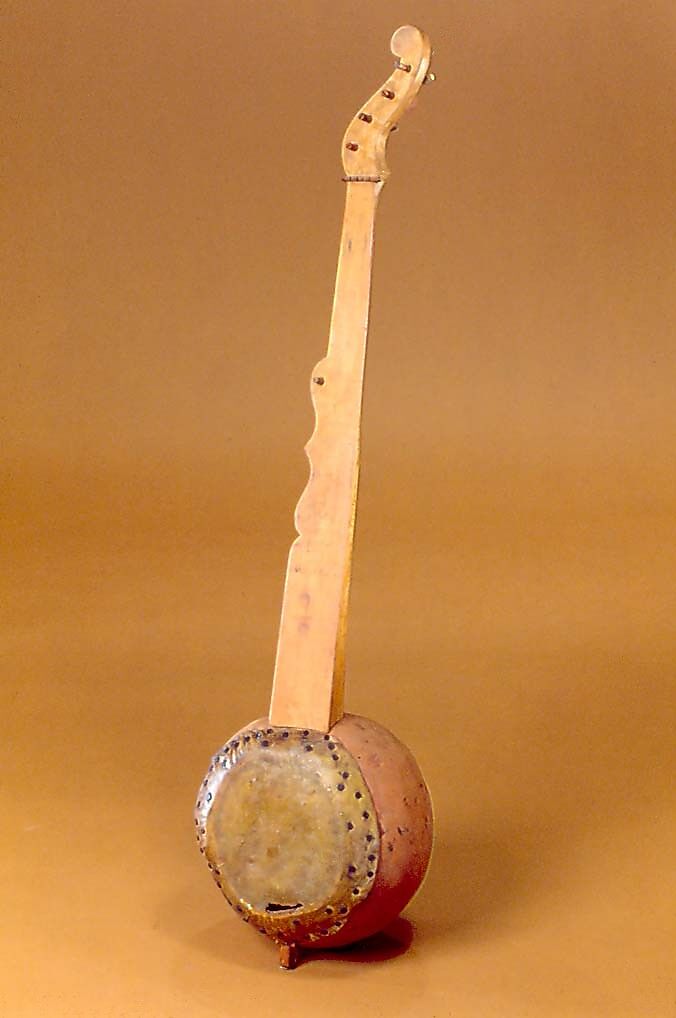 This instrument consists of a gourd banjo body and a banjo neck made by Wm. E. Boucher, Jr., that was likely attached to the gourd body at a later date. The gourd recalls the banjo’s African roots. The earliest sightings of banjo-like instruments in the Western Hemisphere date from the 1680s and describe enslaved Africans in the Caribbean playing plucked lutes with gourd bodies. Because of the fragility of gourds and the ephemeral quality of early pre-manufactured folk banjos, only two early gourd banjo-like instruments are known to exist. One was collected in Suriname before 1777 and the other was found in Haiti before 1872. The gourd body on this instrument shows wear and, while the neck that was originally attached to it has been lost, it is nevertheless one of very few extant pre-20th century gourd banjo bodies found in the Western Hemisphere.