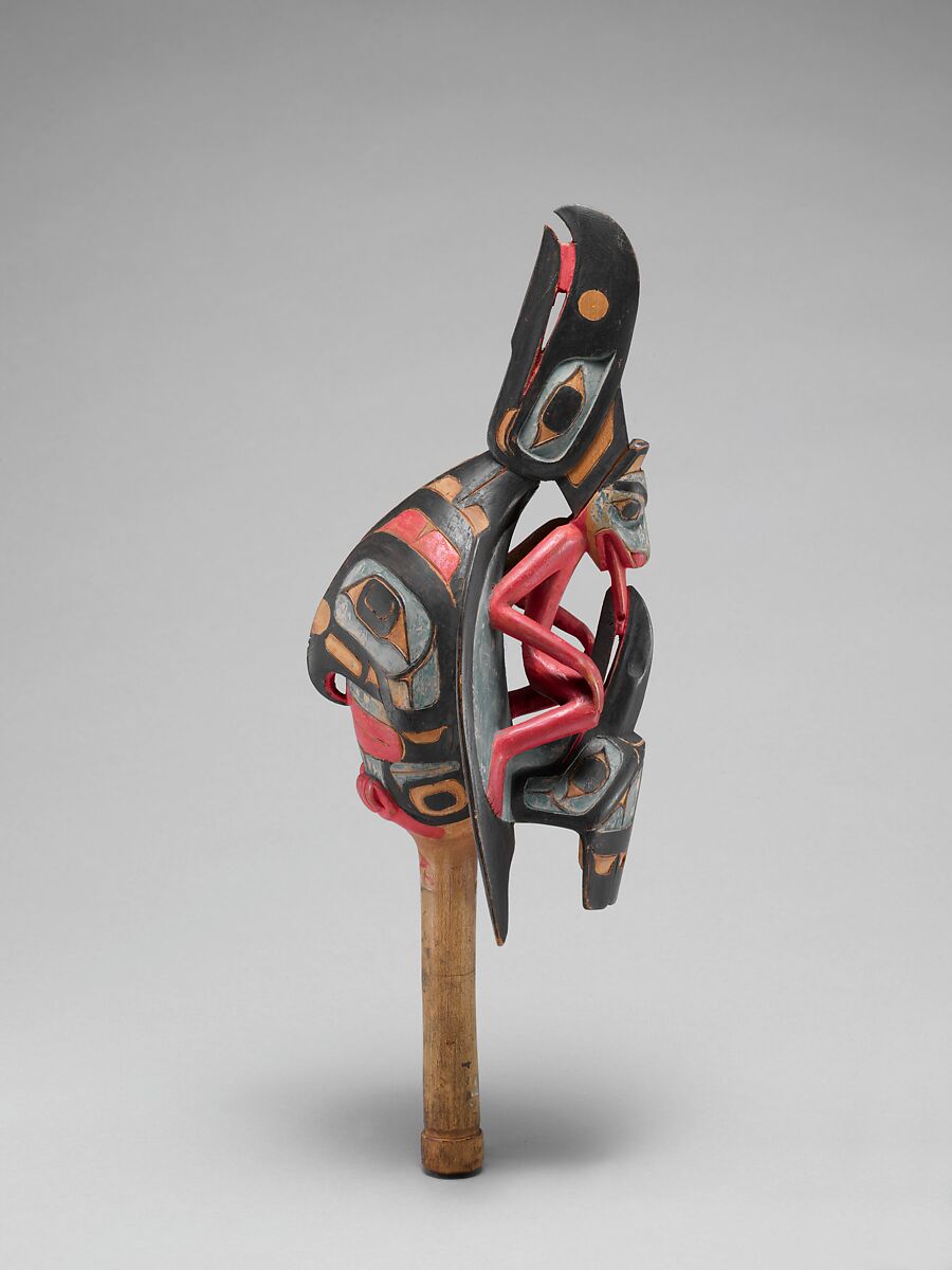 Most often associated with shamanic practices on the Northwest Coast, raven rattles are held oriented with the bird's beak pointing down when used in dance. Additionally, rattles like this are used to channel a shaman's spirit guide and can be used in healing ceremonies. Much of the symbolism associated with this rattle comments on the transmission of power from one figure to the next—the raven to humankind in general (as oral tradition states) and the kingfisher to the prone figure on the raven's back. The prone figure is personified with a face of a wolf, perhaps another guide of the owner of this rattle. Rattles are considered extremely personal objects and bear specific symbolism and power known only by those who understand their meaning. As symbols of power, rattles are also kept by clan leaders. Carved in two pieces and assembled using wooden pins to secure the halves, a rattle usually contains small stones or seeds. Polychrome adornment exhibits the pale blue pigmentation common during the late nineteenth century. It is common for raven rattles to be further adorned with feathers, fur, and beads, particularly along the seam of the two halves and at the handle base.