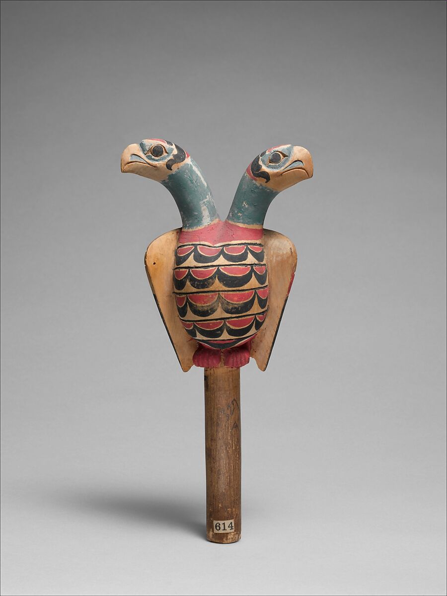 This unusual rattle depicts a double-headed eagle. Animals depicted on Northwest Coast rattles were almost always representations of those found in the natural world. The appearance of this rattle suggests contact between the indigenous peoples of the Northwest Coast and Russian explorers in the nineteenth century who would have carried with them symbols of the Russian imperial double-eagle emblem.