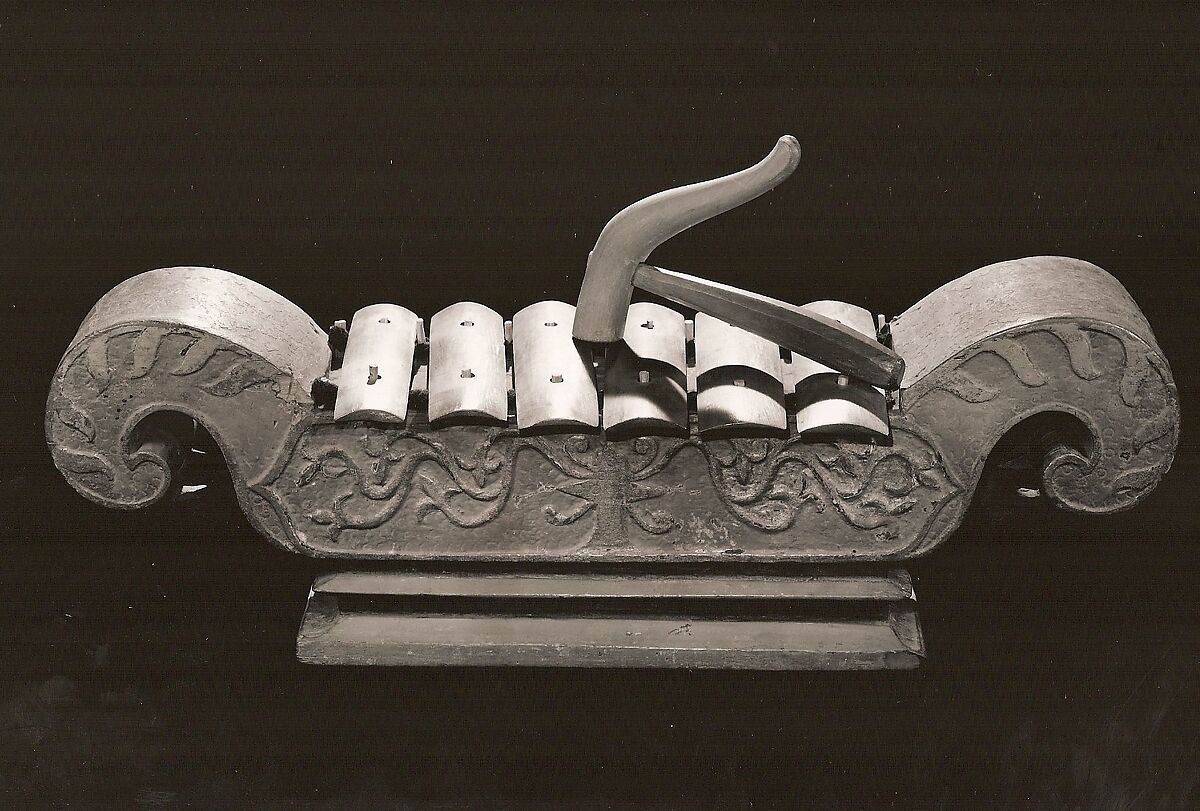 The saron panerus is the smallest and highest pitched instrument of the gamelan ensemble. It is played with a wooden or horn mallet. This example is tuned to the pentatonic scale known as slendro, one of two scales used in gamelan performances.