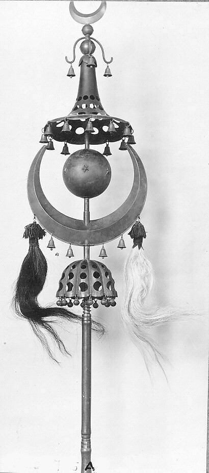 The Turkish Crescent, still used in traditional Turkish ensembles, was an important instrument of European Janissary bands during the 18th century. Also adopted by large military bands, it gradually went out of style in the mid-1800s. The instrument is equipped with bells and jingles and was played by shaking it up and down and in a twisting motion to produce jingling sounds. The Muslim crescent and horsetail plumes are emblems of the battlefield.