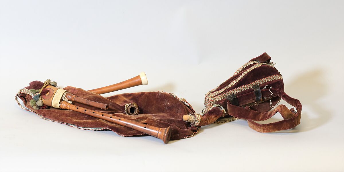 2 drones, smaller in 1 section 175 mm, larger (incomplete) 224 mm, reeds missing (probably single cane reeds); single fold bellows and sheepskin bag covered with plum velvet with red, green, and white braid following seams, the bag also with red, green, and silver tassels fixed at chanter, bellows, and near drone stock;