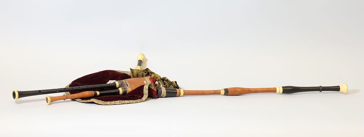 Fake bag of burlap with red velvet, gold-trimmed cover, green satin ribbon near chanter stock both drones mounted with ivory and ebony, stocks mounted with horn, chanter mounted with ivory;