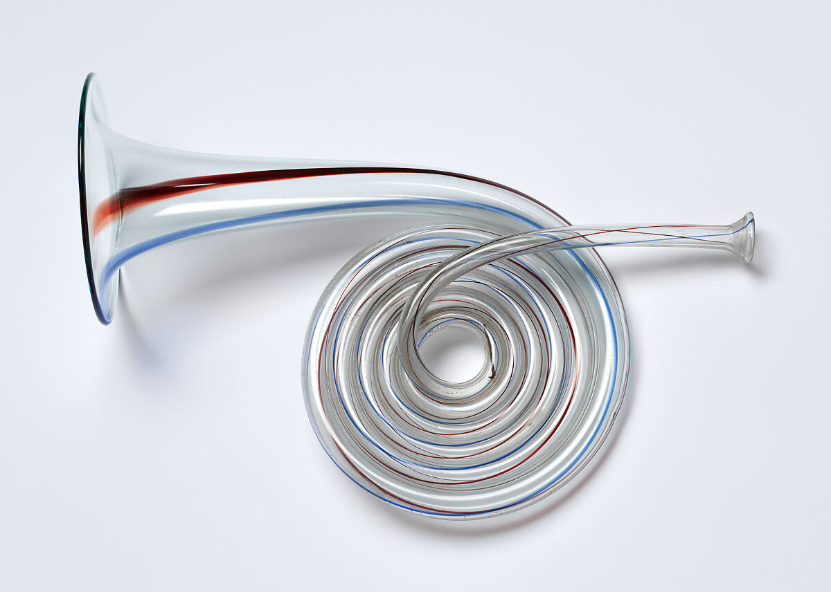 Blown of clear glass and decorated with spiral pinstripes of alternating blue and red, instruments of this kind were produced by glass blowers in Lodelinsart and Chênée in Wallonia (southern Belgium). This instrument imitates smaller versions of brass hunting horns of the sixteenth to eighteenth century and the tromba da caccia (hunting trumpet) used in orchestral music in the eighteenth century.
