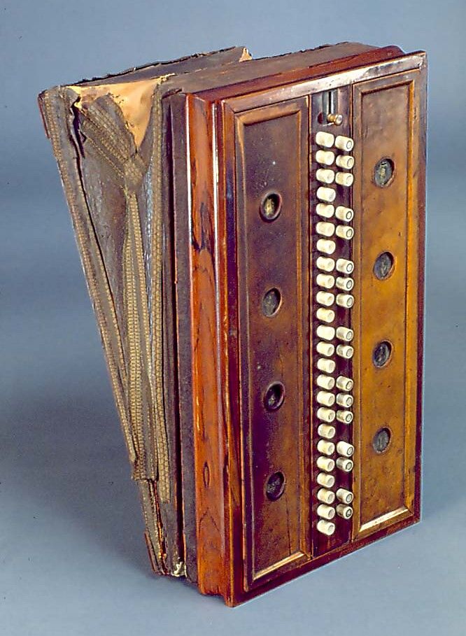 Technical description: Rectangular rosewood veneer case over a diagonally divided double bellows; bellows leather with cloth covering; bellows equipped with two springs (upper one broken) so that pressure on left side sets up rocking motion in bellows; top of instrument has two lengthwise removable maple panels, each with four rosewood-bushed soundholes (some bushings missing), with sliding paper shutters below soundholes for piano and forte effects, operated by horn knob at left of top; rosewood strip between maple panels containing tw rows of ivory button touches, 24 naturals in bottom row and 17 accidentals in top row, the buttons for accidentals having black circles on tops; compass F-a2; brass free reeds beneath removable panels, the touches opening small pallets beneath the reeds to sound them; reeds are blown, not sounded by suction.