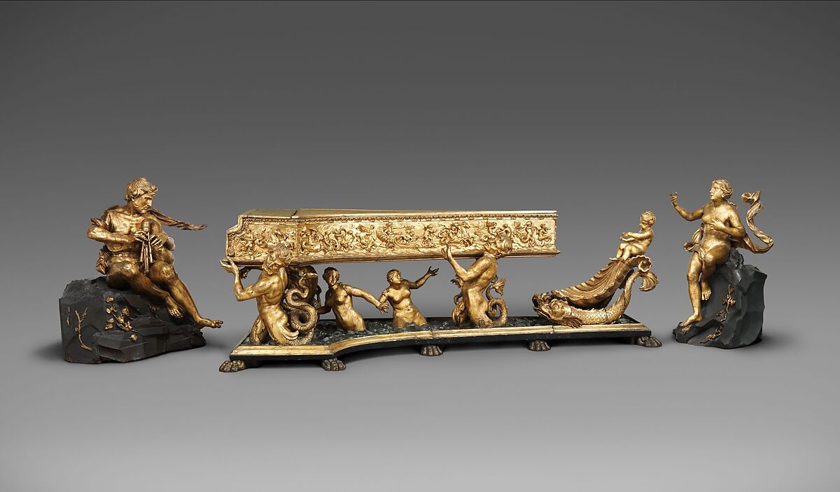 이탈리아에서 제작되었으며 독특하게도 넓은 5옥타브 범위의 하프시코드가 동봉된 도금 케이스로 로마 바로크 장식 예술의 최고작 중 하나로 평가되고 있습니다. 이 악기는 로마에 위치한 토디니의 갤러리아 아모니카(악기 박물관)의 악기 중 하나로 제작되었으며 토디니의 1676년 책자에 설명되어 있습니다. 백파이프를 연주하는 폴리페모스의 측면 모습과 깜짝 놀란 갈라테이아의 모습은 무대장치의 배경 앞 하프시코드와 함께 전시되었을 것입니다. 폴리페모스는 오르간 파이프가 숨겨져 있는 “산” 위에 앉아 있는데 마치 그가 들고 있는 백파이프에서 소리가 나는 것처럼 보입니다. 토디니의 독창성은 똑같은 음악 풍조에서 발전해나가 1700년 피아노를 발명하기에 이르렀습니다.
