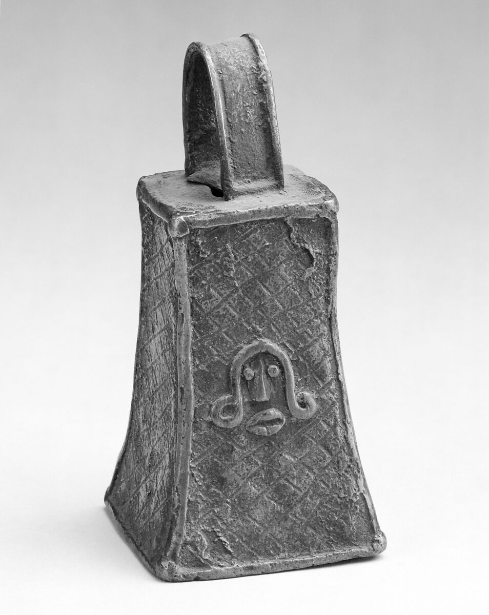 Decorated with a human face and incised patterns, bells like this were worn around the neck as symbols of high rank, were sounded to communicate with ancestors or were placed on altars.