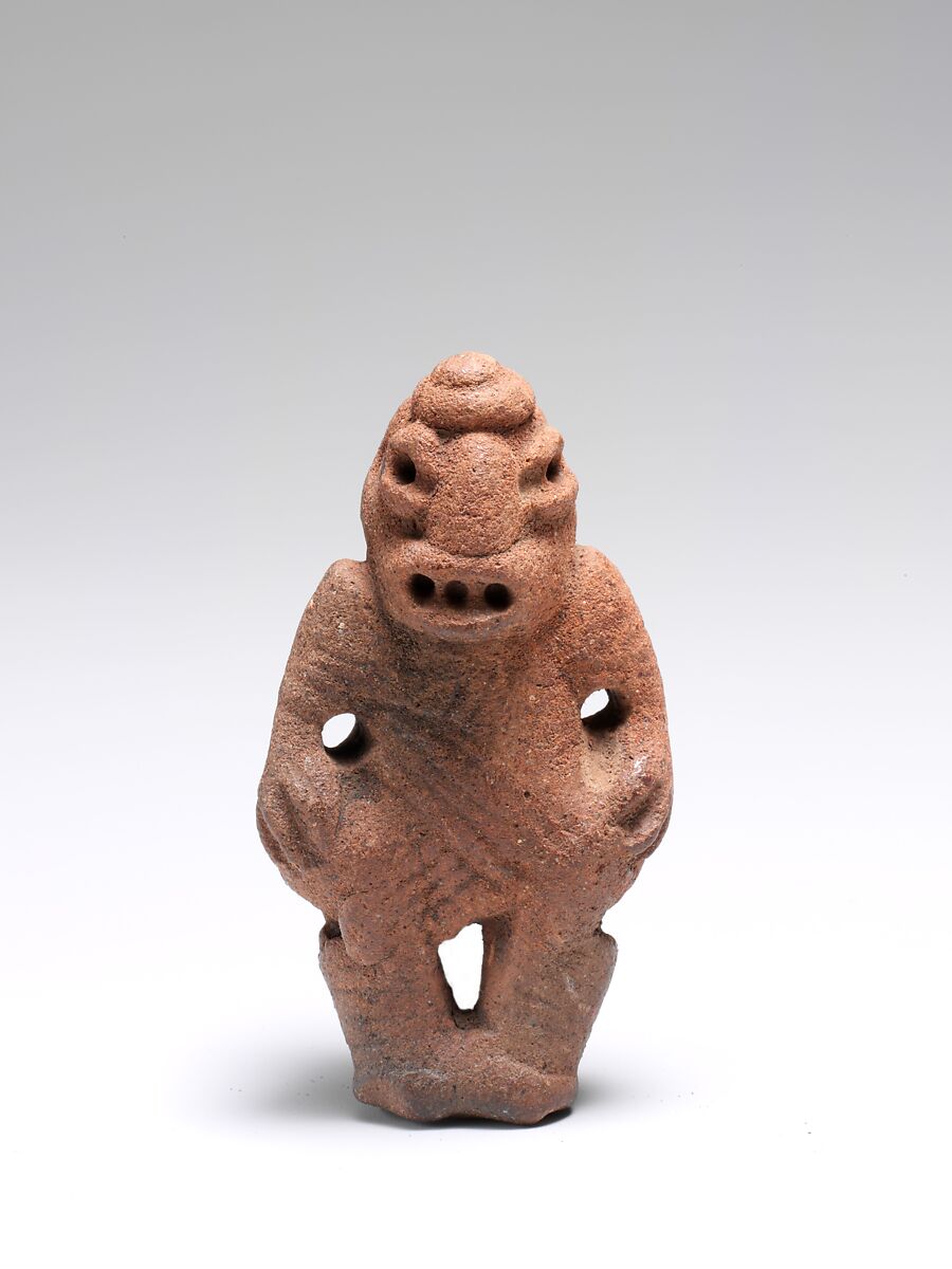 Description: Standing humanoid figure of reddish brown clay, hands placed on enlarged hips, with hollow legs, joined at ankles, forming separate mouthpieces; mouths of whistles located on sides of thighs, at base of hollow spheroidal hips that form separate resonating chambers for whistles; punctate eyes and teeth, incisions delineating costume on figure's torso; pitches of whistles fairly close, producing a shrill effect.
