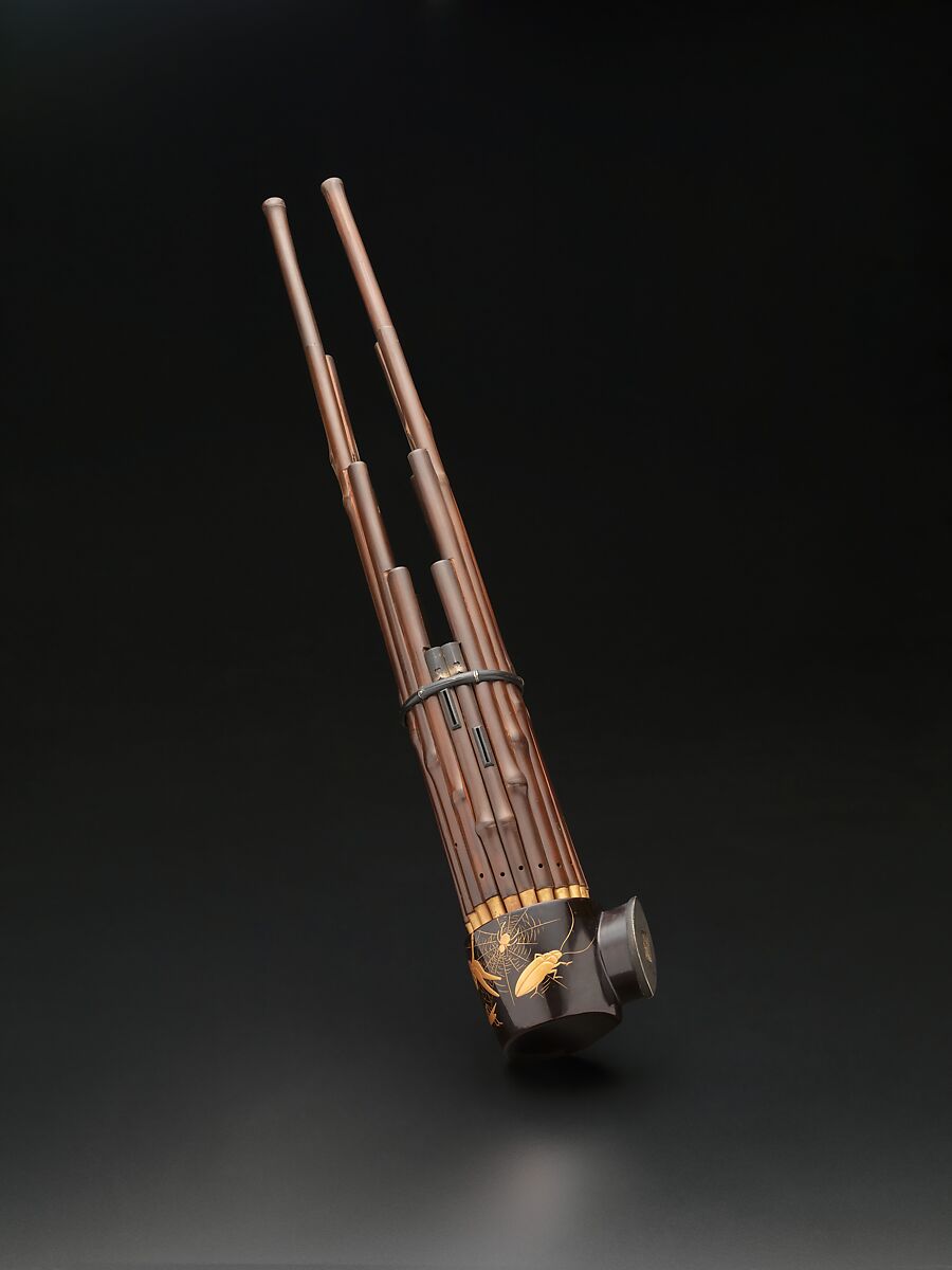 The Japanese mouth organ used in gagaku (court music) descended from the Chinese sheng. The lacquered air chamber is often decorated. Here a spider waits for the next victim to be ensnared in the web.