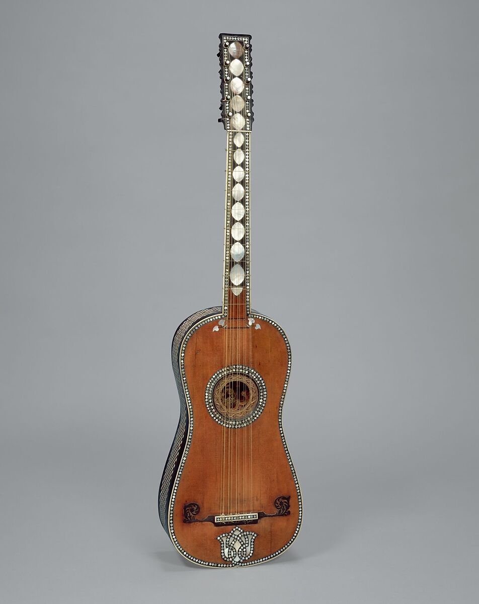 Technical description: Ten-string guitar (five double courses); Two-piece pine soundboard with artificial ivory binding (originally bone) and purfling (inside binding) of b/w/mother-of-pearl diamonds in mastic/w/b; soundhole diameter of 78.78 mm with binding (from inside out) of ebony/w/b/w/mother-of-pearl diamonds in mastic/w/b/w/mother-of-pearl diamonds in mastic/w/b; inlaid mother-of-pearl decoration on the soundboard near the inlaid frets and a larger decoration below the bridge; mustachioed ebony tie bridge (replaced) with ivory top inlaid with mother-of-pearl diamonds in mastic; Back with mosaic of bone, ebony, and mahogany inlaid in wood; mosaic design continues on ribs, back of neck, and back of headstock; ebony fingerboard with large oval pieces of mother-of-pearl inlaid in the center and the binding/purfling pattern matching the soundboard, with ten gut frets tied to the neck and two inlaid ebony frets (not original) on the soundboard; two-piece laminated headstock continuing the decorative mother-of-pearl inlay decoration and binding/purfling design from the fingerboard, ten friction pegs. (Daniel Wheeldon, 2016)