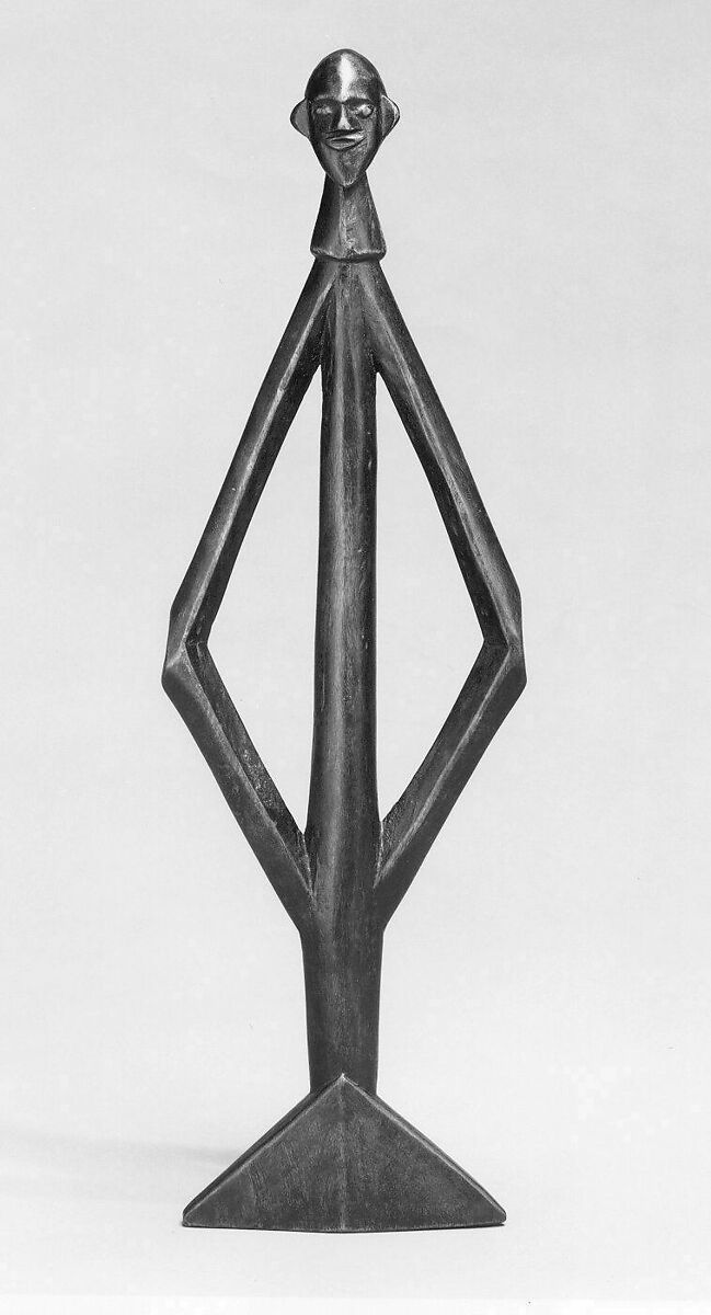Whistles, which may produce three or four notes, are used by musical groups and by hunters for signaling. The whistles sound alternately in the manner of European and hand-bell ensembles, with each performer producing a different pitch or pitches. A voice might also supply certain notes. This Janus-head form, with finger holes in each "elbow," is similar to other whistles which suggest a human anatomy.