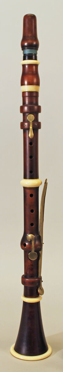 Technical description: Dark stained boxwood with ivory ferrules and brass keywork. Five pieces: mouthpiece, barrel, upper section, lower section, bell. Long tenon English-style mouthpiece grooved for cord. Typical English-style flask shaped barrel. The keys are mounted in square wooden rings, which is rather archaic for an instrument made around the middle of the 19th century. Speaker liner projects about 4mm into the bore. Levers for L4, tone-hole and key for R4 mounted in a bell-shaped swelling. Zig-zag F♯3/C♯5 lever guided in a rudiment of a round turned wooden ring.