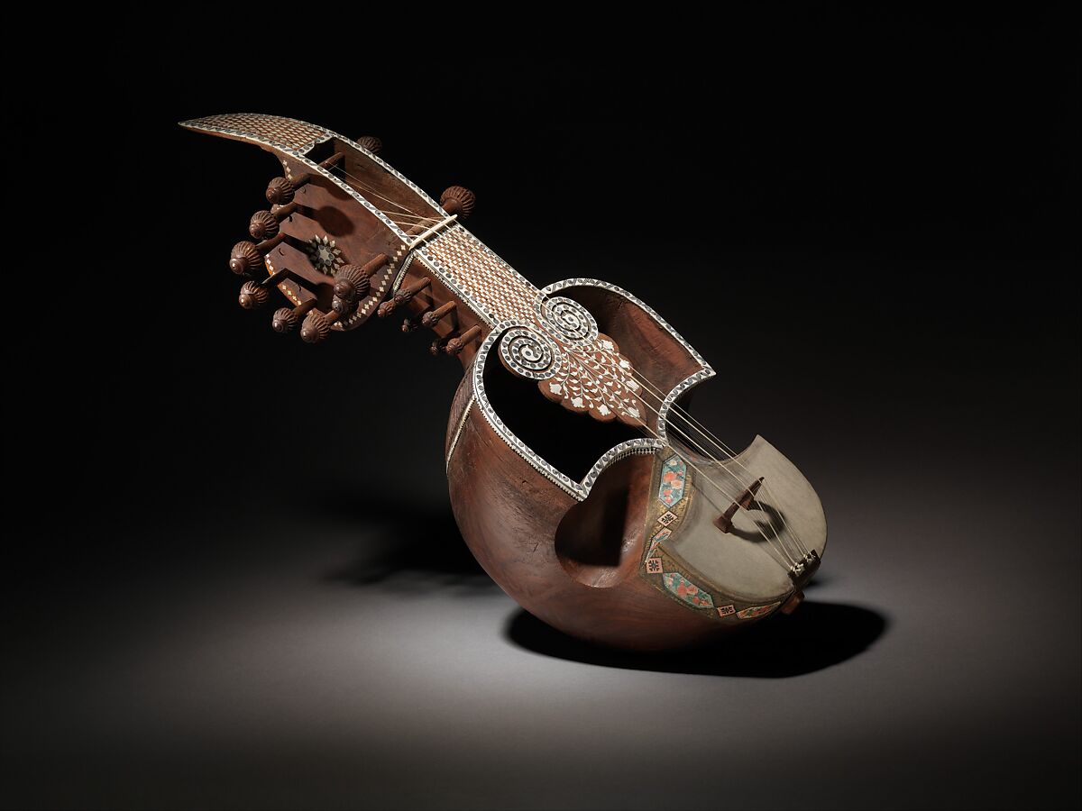 The sārindā's bi-partite body is carved from a single block tun (Cedrela toona) wood and the lower section is covered with parchment. This elaborate version is decorated with ivory and bone. It's four melody strings sound when bowed activating the twenty-four sympathetic strings which are guided through the lower part of the bridge to holes in the fingerboard. Double-chested fiddles are found in South Asia and southern Afghanistan and is derived from qobuz of Central Asia. It is used to accompany dance, flute and vocal music.