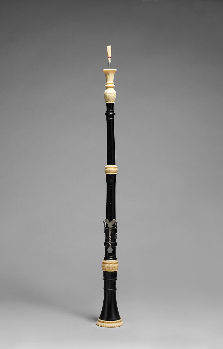 Hendrik Richters (1683–1727) is considered to be one of the finest oboe makers of his period. About 30 oboes survive from the shop he shared with his brother Frederik (1694–1770). Some, like this one, are lavishly decorated with expensive materials. The brothers used the state-of-art eighteenth-century technology to lathe the instrument's ornamental turnings. The metal keys, engraved with floral designs, musical and dancing figures, were fashioned by professional silversmiths or engravers. French instrument makers invented the oboe late in the seventeenth century by redesigning the treble shawm. In contrast to the loud shawm, the oboist takes the reed between the lips enabling the player to control the articulation, volume, pitch, and quality of sound. This permitted more expressivity, a musical trait of growing importance during this period. To enhance playing technique, two keys, the C and E-flat, were added to the oboe. Since some players were accustomed to play with the right hand down and others with the left hand the E-flat key appears on both the left and right side of the "swallow-tail" C key.