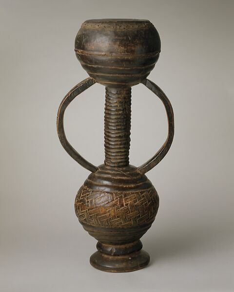 Like the interlocking rhythmic patterns typical of Sub-Saharan music, Kuba carvers embellish the surface of their drums with intricate interlocking geometric patterns and repetitions that are similar to woven textile patterns. Sculpturally, outcurving arms and a central column, like those on this dumbbell-shaped example, are a feature of specific Kuba drum types.