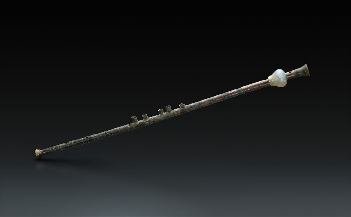 The tibia was sounded with a double reed, and two pipes would have been played simultaneously. The small tubes or chimneys projecting from the side of this instrument and the rings encircling its body were likely part of a complex mechanical system designed to increase the number of notes and modal scales that could be played on a single instrument.