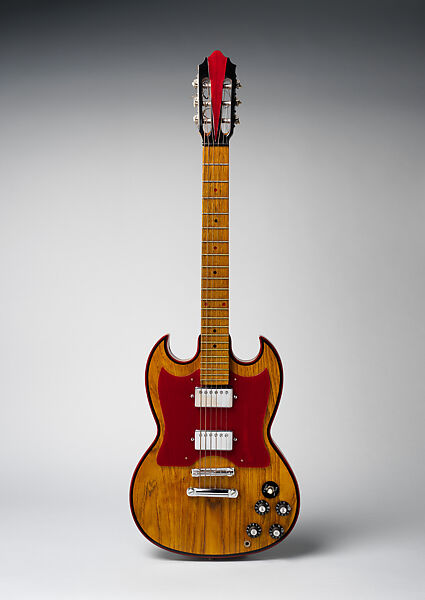 Description: Solid wood body carved with slight waist and truncated shoulders forming a horn-like projections at top, flat back and front, on back red plexiglas rectangle at neck and trapezoidal red plexiglas at lower left covering makers mark, edges outlined in red and black; insets routed out for stringholder, nut, two pickups, and neck; red plexiglas pick guard; four control knobs, socket and a toggle switch at lower right; strap button at top (behind neck) and bottom of body; fingerboard with 22 brass frets and red and black position markers; peg block with machine pegs and front covered with red and black plexiglas; trapezoidal wood case.