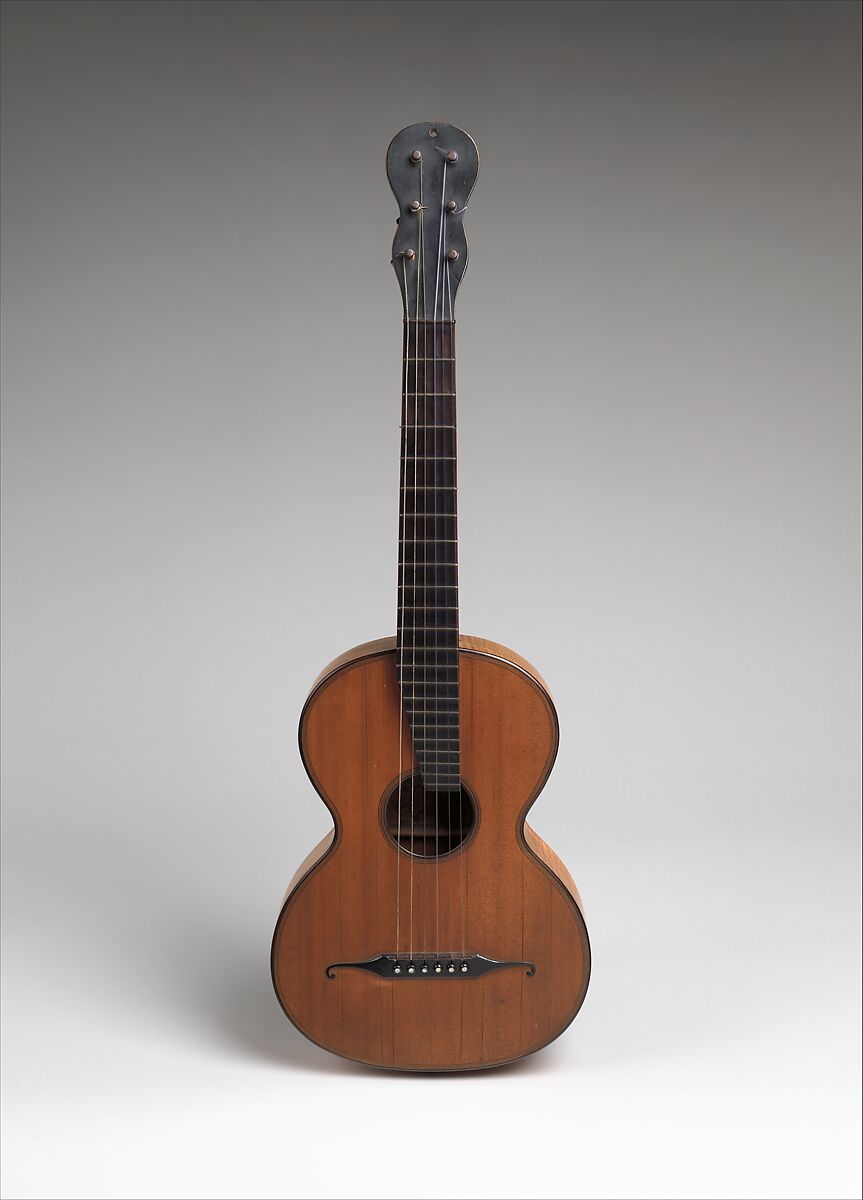 An engraved paper label in the body states: “Nach dem Modell / des Luigi Legnani 3347 / von Johann Anton Staufer / in Wien N-480 / Stauffer [MS signature].” Rinaldo Luigi Legnani (Ferrara, 1790–Ravenna, 1877) was a guitar virtuoso as well as amateur violin and guitar maker who eveloped a guitar design emulated by Stauffer. This example has a small, narrow waisted body with a one-piece back, sides of maple, and top of spruce. The neck angle (and thus the height of the strings, or the “action”) can be adjusted with a key mechanism. Johann Anton Stauffer was the son of Johann Georg Stauffer.