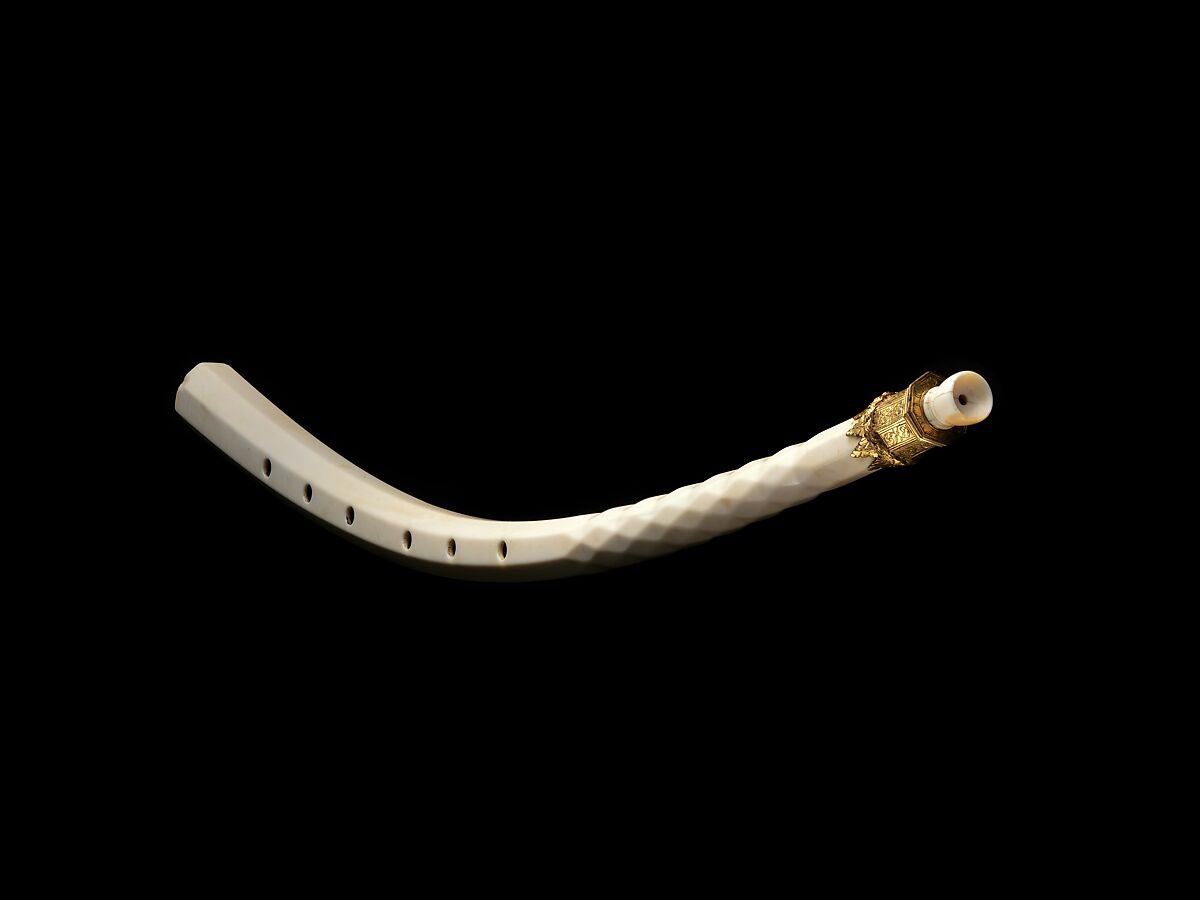 This cornetto has an octagonal body, slightly curved, and narrower at the top, where it is carved with a pattern of diamond facets. A gilt and engraved ferrule encircles the top of the body.