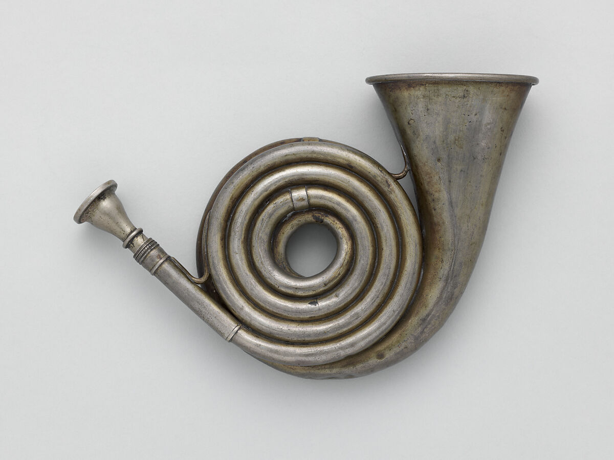 This horn is 5 ½ feet long, but its tightly coiled tubing and small, oval-shaped bell enabled it to be carried with ease in a pocket. This compact form of the horn was used for the "small hunt" of rabbits, squirrels and other small game pursued on foot.