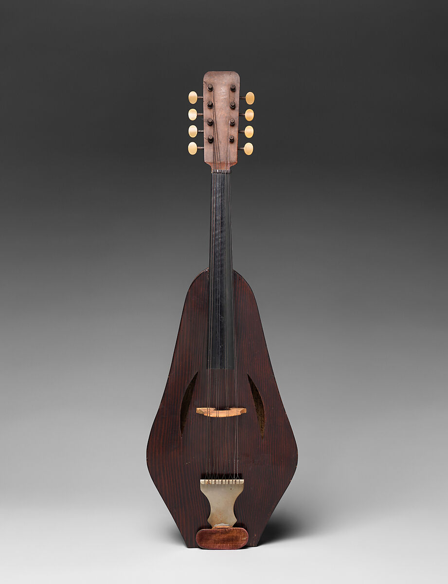 Description: Lozenge-shape body with lower end (tail) squared off; arched front (pine) and back; two D-shaped soundholes flaking a crude, high violin-type movable bridge with blocks added under the feet; ebony fingerboard (unfretted) extending above top from an angled violin-type neck terminating in a flat tuning head with geared machine pegs; four pairs of wire strings (lowest two pairs overwound) attached to a wide metal tailpiece that also holds a velvet-covered chinrest; violin-type bass bar and sound post within; dark brown varnish.