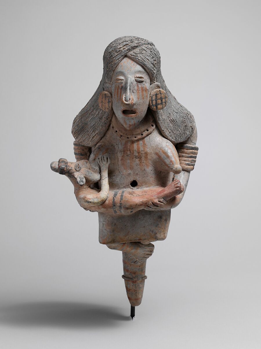 A large perforated rattle typical of Jalisco rattles of western Mexico is concealed behind the nursing female figure.