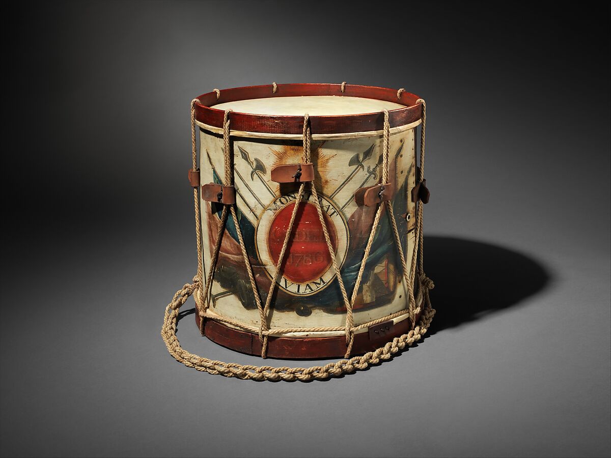 The drum bears a large painted decoration on a white field. The composition has at its center a large red oval with the words: CADET / 1786. Around the central oval is a white ring with the Latin motto: Monstrat Viam. Above this sits a five pointed star. Taken together, these symbols and mottos attributed the drum as having been made (or decorated) for a member of the First Corp of Cadets in Boston, Massachusetts. That military unit was founded in 1786 and had a storied history. This drum, likely made in the 1830s or 40s, may have been built for an anniversary or other important event marked by the corps. Around this central decoration is painted an assemblage of military equipment including flags, cannon, halberds, and drums. This decoration is rather unusual on American drums, which traditionally feature an American flag or eagle. The grouping of military accoutrements is more common on European examples. Another Boston drum, also by Prentiss, located at the Boston Museum of Fine Arts has a similar composition and was signed by the artist Charles Hubbard.