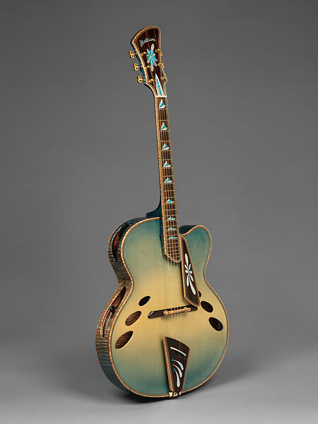 The "Four Seasons" guitars are a complete musical ensemble conceived and built by the master luthier John Monteleone between 2002 and 2006. Each instrument is a beautiful sounding guitar with its own individual voice that also functions musically with the other members of the ensemble. Spring was built in 2006 and was the final instrument in the quartet. The top is carved out of two pieces of bookmatched quartersawn spruce with a bear claw pattern. It has a cutout on the treble side allowing players to access higher frets on the instrument. The body has a sunburst white to light blue nitrocellulose finish. The soundholes on the top of the instrument are unusual, with three small soundholes on each side of the guitar where traditionally would be found f-holes. The back is carved out of two bookmatched pieces of slab sawn maple with an irregular curly pattern. The bridge is made of two pieces of Macassar ebony with two set screws that allow for adjustment. The fingerboard, headstock veneer, and binding for the body are made of Macassar ebony. Mother-of-pearl and reconstituted turquoise stone are inlaid in floral petal motifs on the pickguard, headstock, and tailpiece. The same materials in triangles are inlaid on the fingerboard as position markers as well as used for the truss rod cover on the headstock. Inlaid diamonds on the side of the neck mark the positions above the 1st, 3rd, 5th, 7th, 9th, 12th, 15th, 17th, and 19th frets. The bass side rib, which faces the player, has two elliptical sound holes that give the musician a better sound experience while playing. Inside, opposite the sound holes, are inlaid flowers of mother-of-pearl and reconstituted turquoise.