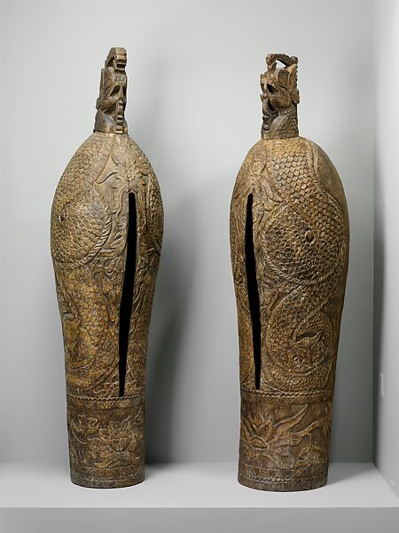 Slit drums or gongs, hollow percussion instruments with a central resonating chamber whose only opening is a narrow slit the edges of which are struck to produce drum-like sounds, occur in a variety of forms in Island Southeast Asia. Smaller types, made from wood or bamboo, are frequently played as part of musical ensembles. By contrast, larger slit gongs, often made in pairs, such as these imposing examples from the Island of Madura, were predominantly used as signaling devices. Set up under a shelter in the village, they were sounded with wood beaters to announce important events. While some large slit gongs were suspended from lugs at the top, the pair seen here were probably freestanding. On Madura, large slit gongs were used to warn the community of natural disasters, crime, and other significant incidents. They were also reportedly rung, like Western church bells, to mark the passage of time. During the night the large gongs were sounded hourly and certain households would beat smaller slit gongs in response as part of a rotating system that kept watch over the village.