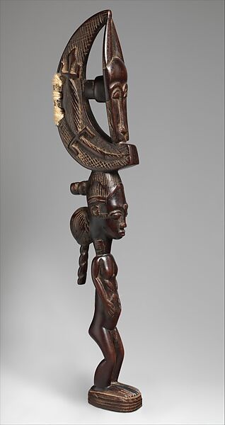 Handheld P-shaped wood beaters like this, known as lawre waka or lawle, are used in the Ivory Coast by diviners (komien) to strike a flat, flanged iron bell whose steady beat helps to induce and maintain a trance state. The entranced speaks with the voices of nature spirits to prescribe cures. The bell's sounding may last for hours, and after it is silenced may resume if the trance begins to wane. The handles of these mallets are typically carved to represent a coil, but in this example that motif has been replaced by an elegantly sculpted female figure with an elaborate coiffure. Aligned within the padded crescent-shaped striking portion of the mallet is a masklike dje (steer) head that also helps to transform a musical accessory into a work of art. Lawle are one of only a few items in which the Baule people incorporate dje heads.