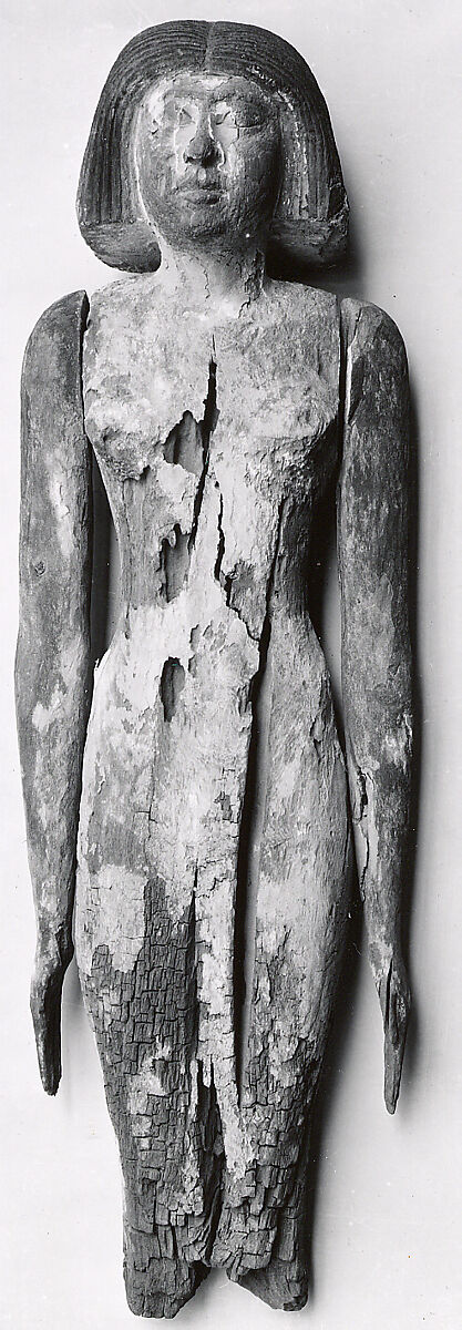 Most of these statues represent Merti in various aspects of his life and career, denoted by changes in wigs and garments. Surprisingly, three statues of women were also present, each in a different wig. Although more damaged, this female figure is carved by a more skilled artist than 26.2.3: the proportions of the human figure are more lifelike and less elongated.