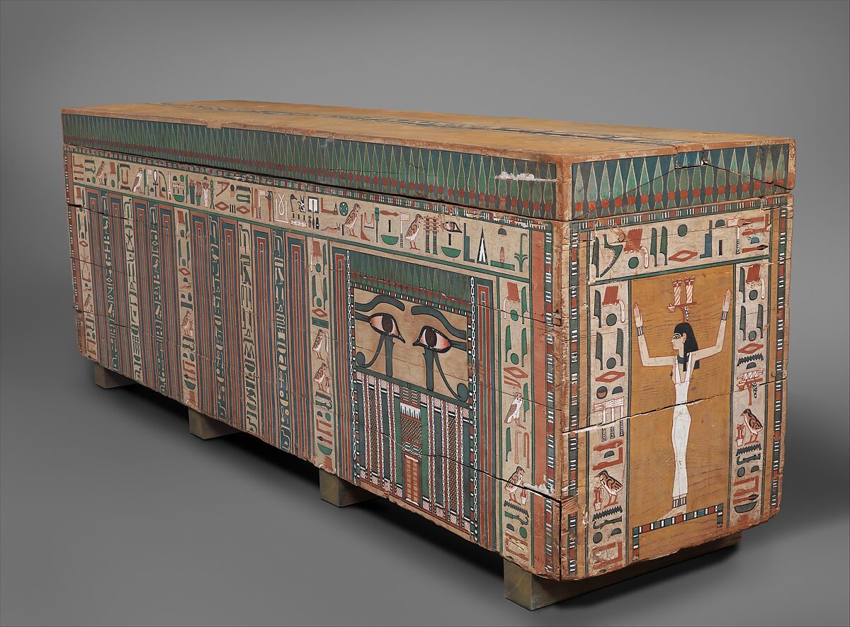 On the left side of the coffin box there is an architectural facade with a small doorway in the center at the bottom. This is the equivalent of the Old Kingdom false door. In this case, it is painted to resemble two wooden door leaves secured with two door bolts. Above the door are two eyes that were directed towards to east, the place of sunrise and rebirth. The face of the mummy would have been directly behind this panel. The rest of the exterior is inscribed with invocations to, and recitations by, various primeval deities, particularly those associated with death and rebirth, such as Osiris, foremost god of the dead, and Anubis, god of embalming.