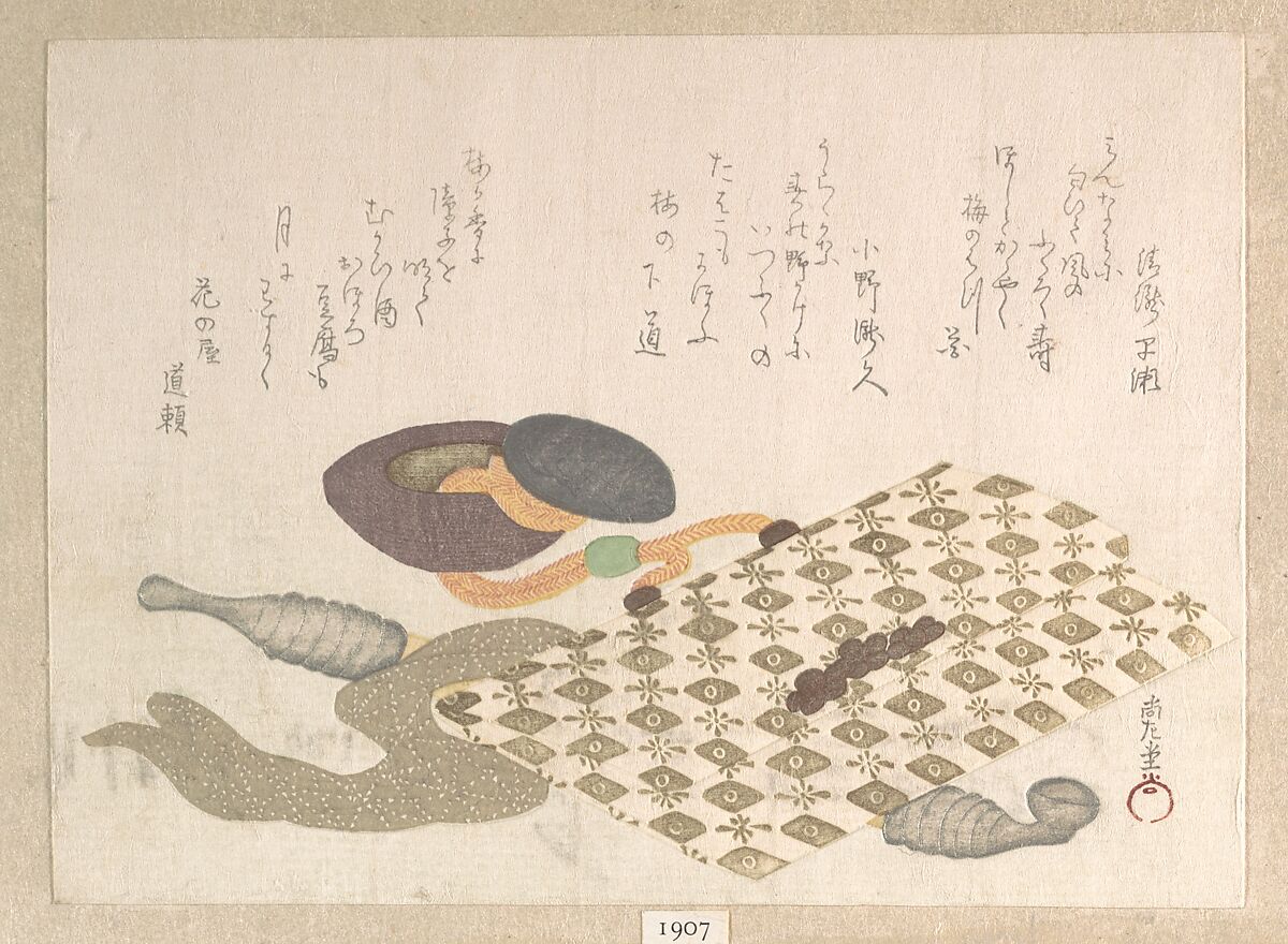 Surimono are privately published woodblock prints, usually commissioned by individual poets or poetry groups as a form of New Year’s greeting card. The poems, most commonly kyōka (witty thirty-one-syllable verse), inscribed on the prints usually include felicitous imagery connected with spring, which in the lunar calendar begins on the first day of the first month. Themes of surimono are often erudite, frequently alluding to Japanese literary classics in both texts and images.