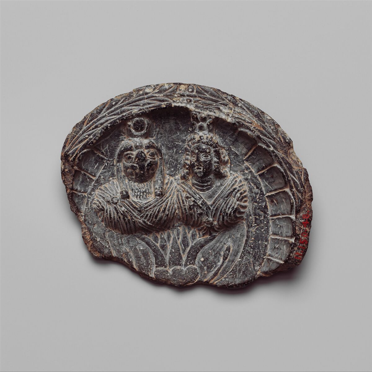- Title: Shallow dish with high relief figures of Isis and falcon-headed Horus