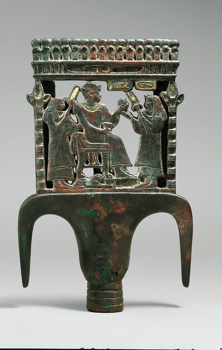 This palm (joining piece) of a ceremonial fan depicts a royal baldachin atop an umbel, the flower section of the papyrus plant. On the back of the palm are sockets for three ostrich plumes, and the lower end is made to fit onto a long staff. Goddesses holding feathered fans flank the pharaoh seated inside the baldachin. One of the royal cartouches appearing just below the cornice could be a poor version of one of the names of the Middle Kingdom pharaoh Amenemhat III. His pyramid complex at Hawara was a favorite site for burials in Roman times, and many mummies with panel portraits were found there. This fan might have been used in a temple at nearby Arsinöe, capital of the Fayum.