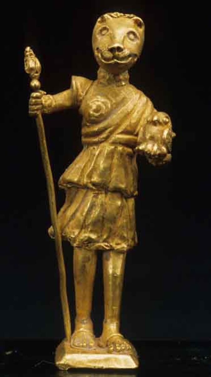 On the other hand, the snout and ears appear short for Anubis and more like those of a cat, and the short dress can be worn by Artemis who is associated with Bastet. The identity of the figure is, therefore, not certain.