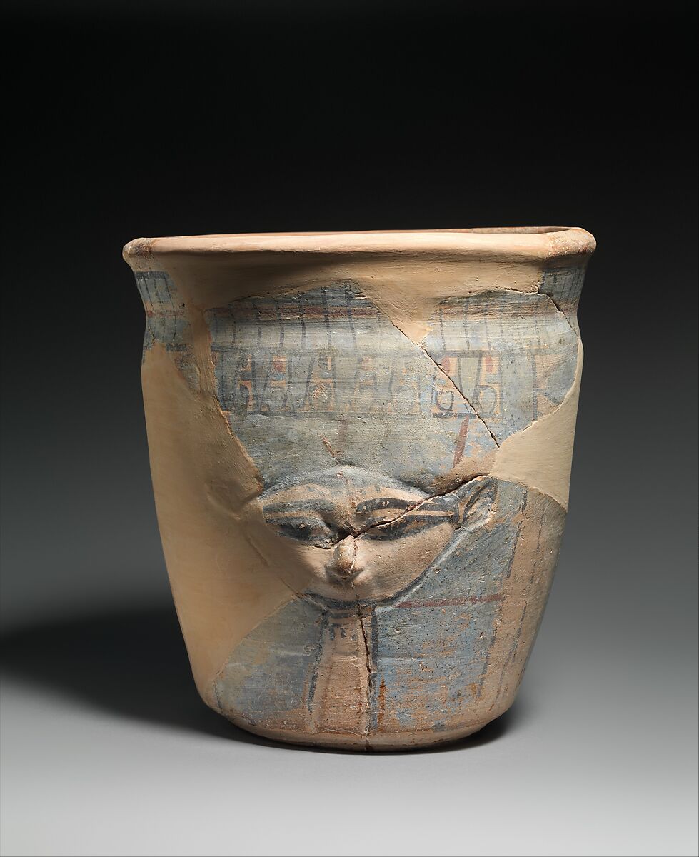 The preserved neck has a relief Hathor emblem on opposite sides. The goddess face was probably formed by pressing the clay into a mold formed for the purpose – the pressure of fingers can be seen on the interior of the jar. The Hathor face wears a blue straight wig, bound at intervals by red ribbon. On the other sides are bound papyrus motifs between animal-headed scepters known as was scepters.
