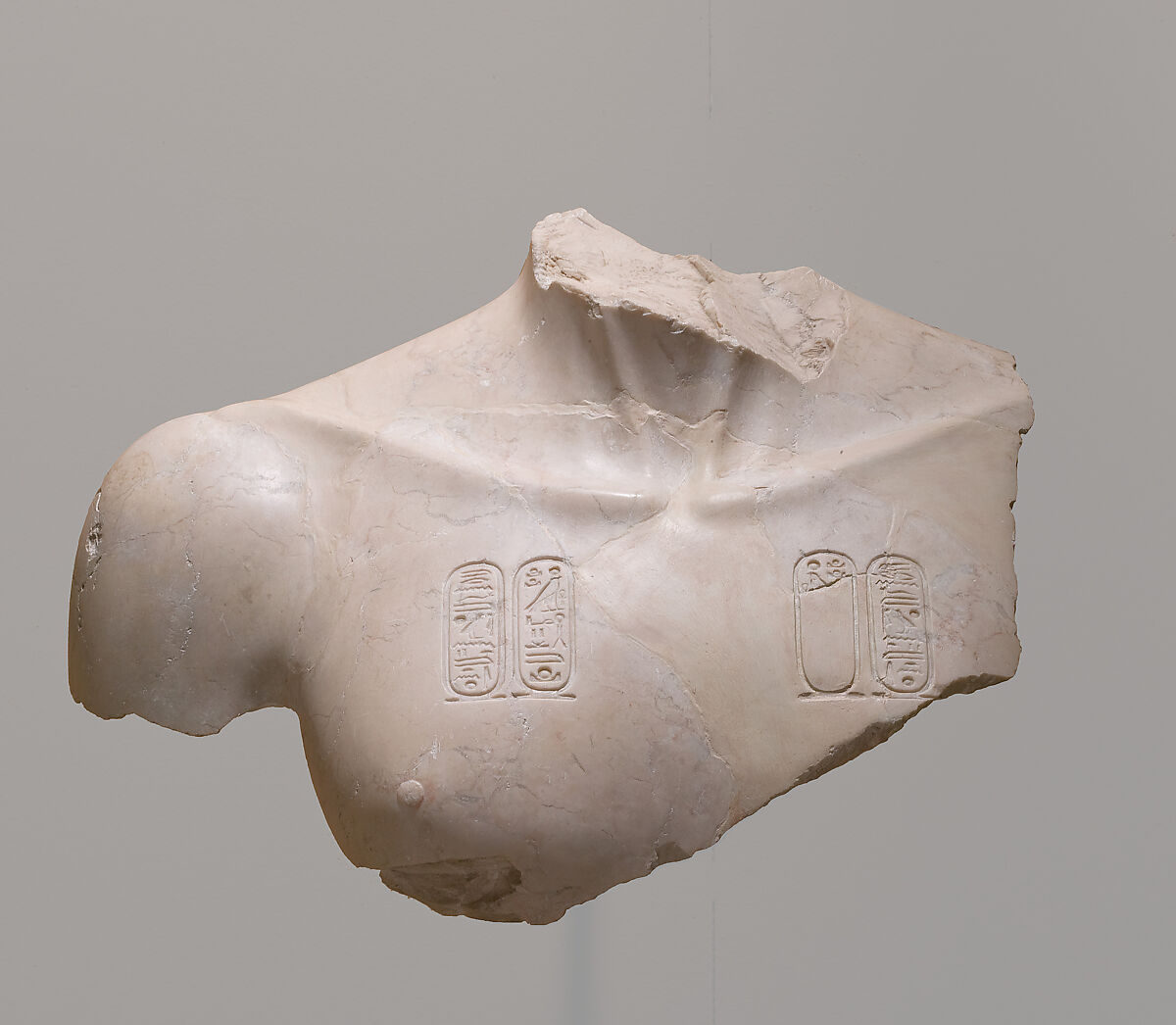 Several fragments discovered in excavations at the Great Aten Temple in Amarna were rejoined to form these shoulders and upper chest of Akhenaten. The sharp tendons in the throat and the prominent clavicles are characteristic of the heightened attention to the bony structure of the bodies of members of the royal family. Cartouches of the Aten appear on the king's chest; a third pair would have appeared on his abdomen, and others on each shoulder, and perhaps also on his wrists.