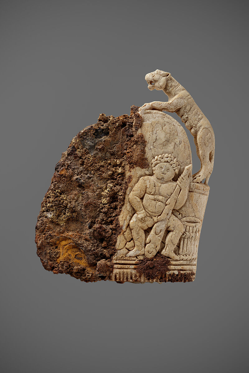 The ivory handle has a tiger or panther carved three dimensionally on the outer edge. On its face is Herakles with his club, resting after cleaning the Augean stables. On the lower right is the container he used to capture the river water, which, according to the myth, he diverted for that purpose. Notched decoration occurs at the lower edge, and notched and crossed decoration is visible on the back. An iron blade extends almost two-thirds of the way into the handle, although the blade and details of its fitting are obscured by heavy corrosion.