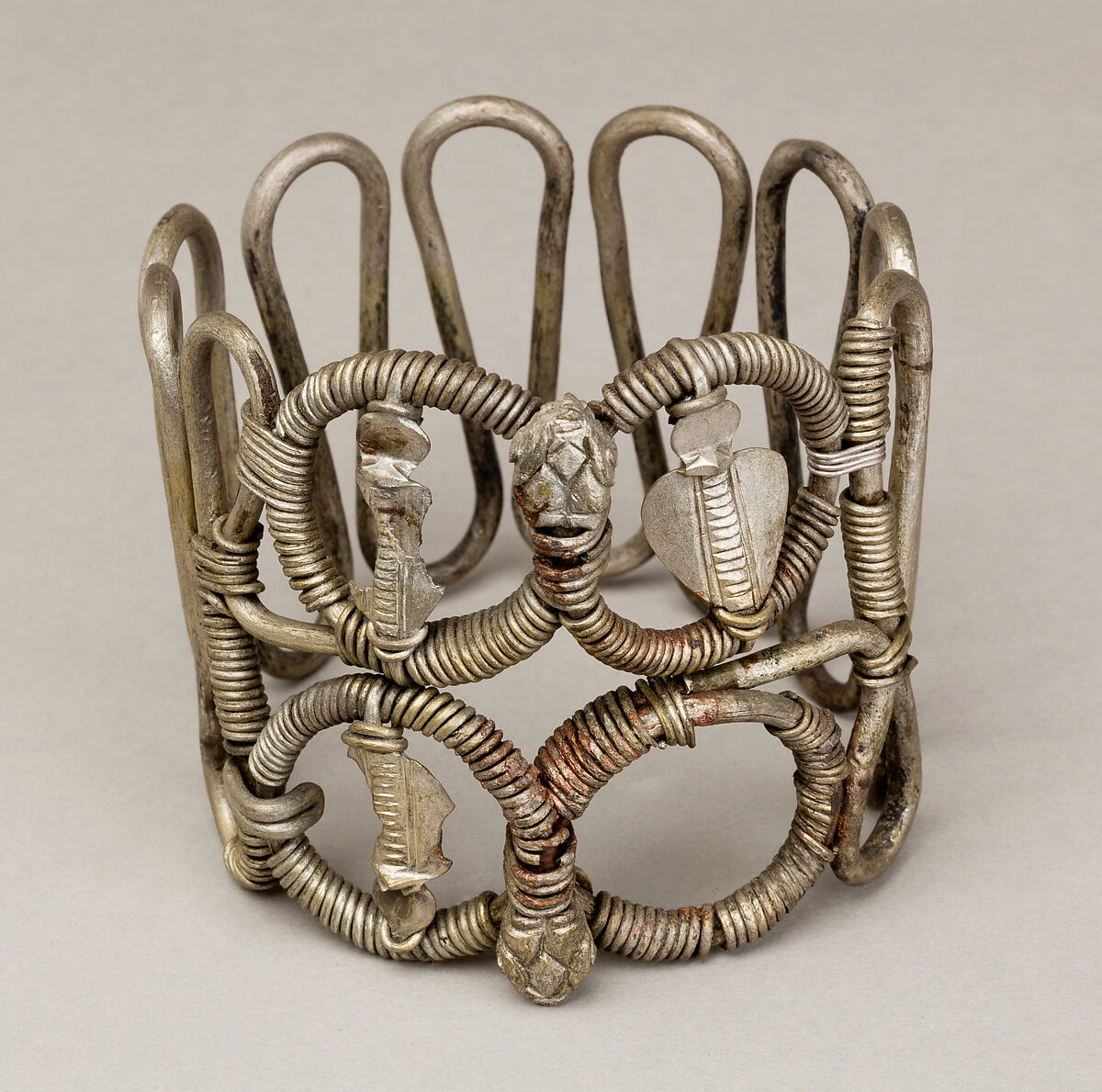 The bracelet is constructed from two thick wires bound together using a thinner wire, which serves both to join the pieces and to create a looped decorative pattern. Four silver rearing cobras, known as uraei, were secured to the front, although one is now missing, and two snake heads pointing up and down were carved into the hammered tips of the thicker wires. The bracelet could be produced without using any heat or soldering technologies.
