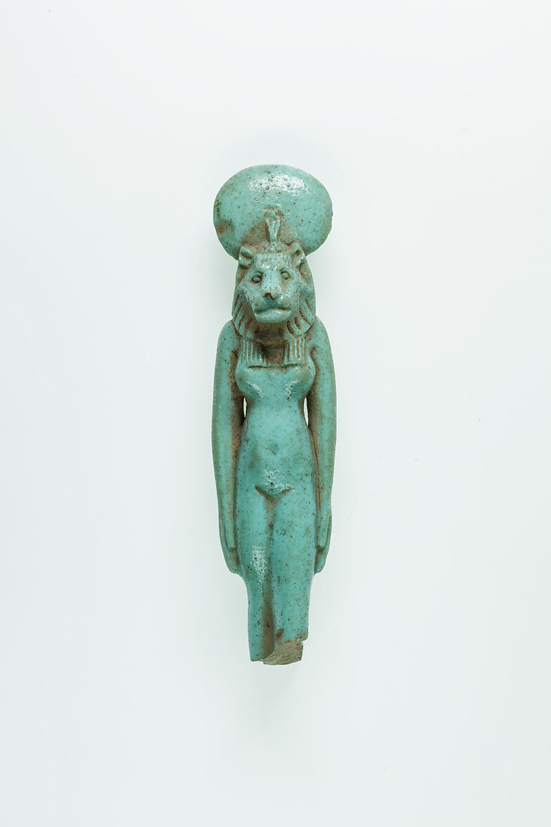 Lion-headed goddesses in Egypt encompassed numerous deities including Sakhmet, Wadjet, and Bastet, among others. In this guise, the goddesses were fierce protective deities, but ones that could also bring about destruction on behalf of the gods, both through violence and through plague and pestilence. The sun disk, when worn by a lion-headed goddess, is sometimes linked with Wadjet, and alludes to her role as the daughter and eye of the sun god Re, but many goddesses shared this aspect and similar inscribed statuettes name several different deities; without an inscription or context, it is difficult to assign a precise identity to this figure.